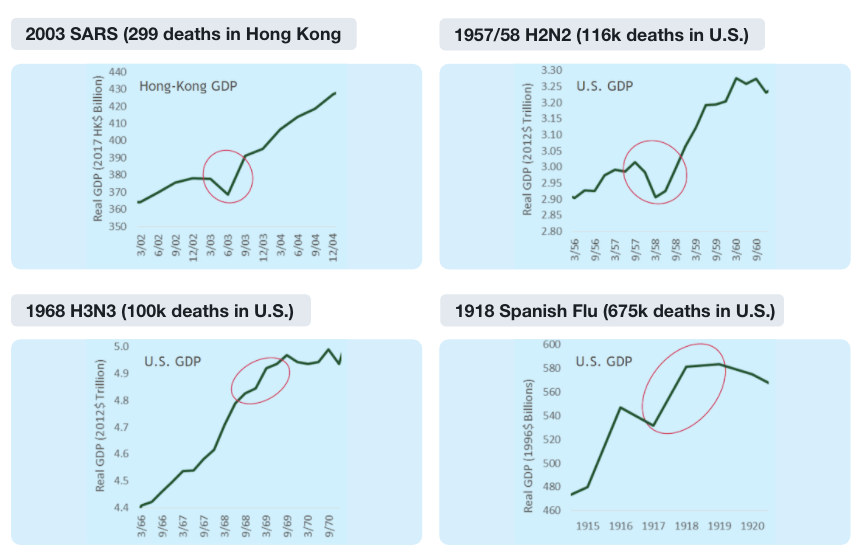 Históricos de pandemias anteriores apresentam uma retomada em V da crise. Precedentes são interessantes para criação de cenários e apresentam bons resultados a médio prazo, embora não sejam uma obrigação.